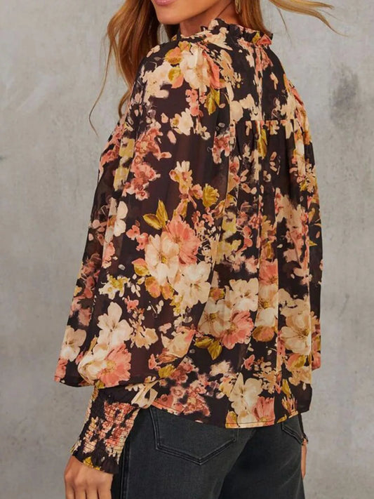 Floral V Neck Long Puff Sleeve Breezy Blouse