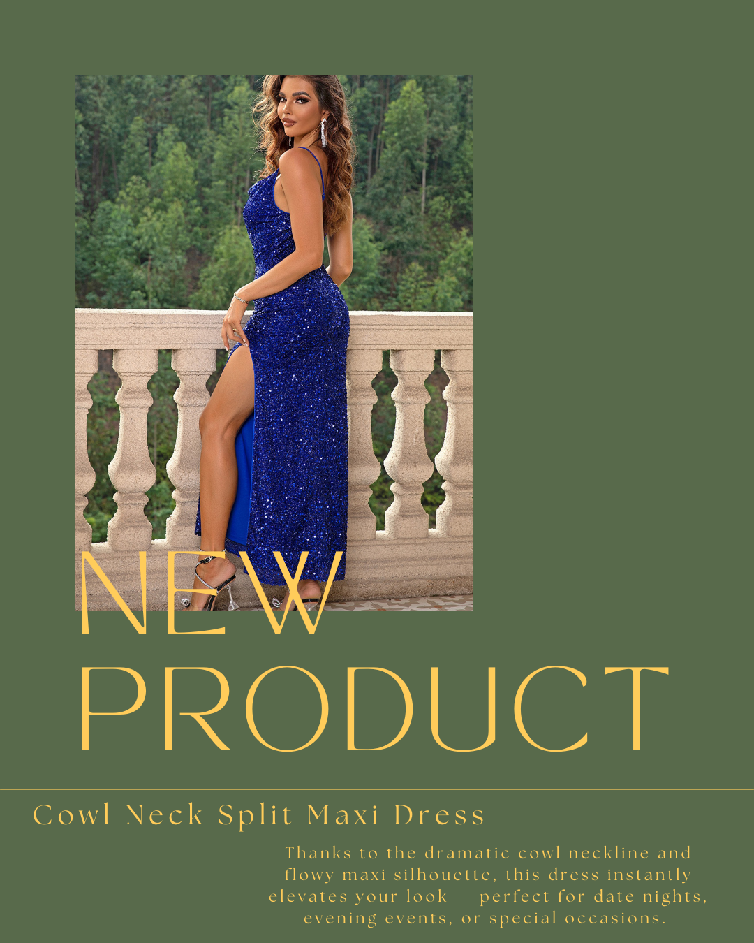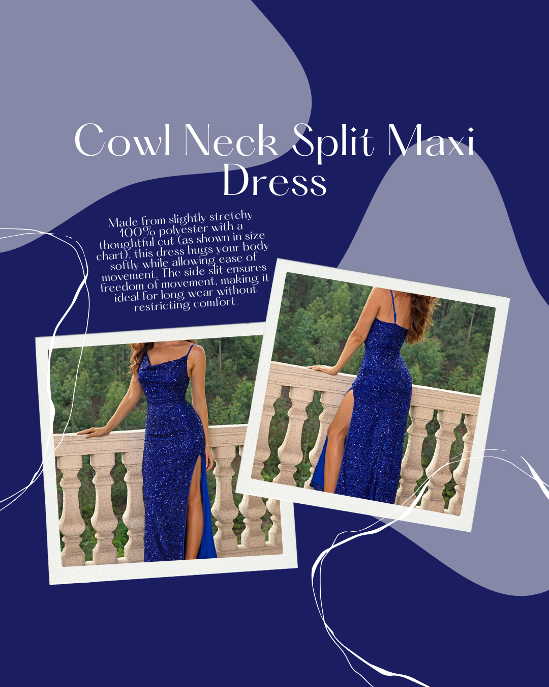 The cowl neckline offers a soft, draped look that elegantly frames your neckline and shoulders, creating a graceful and feminine silhouette. The maxi length elongates your figure for a slim, tall appearance, while the slit adds a subtle touch of sensuality and movement — perfect for making a statement without sacrificing comfort.