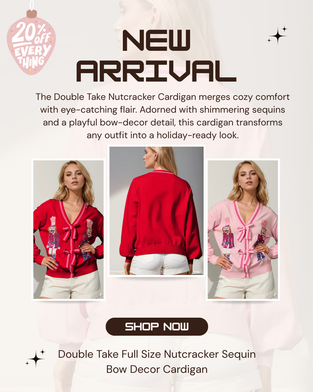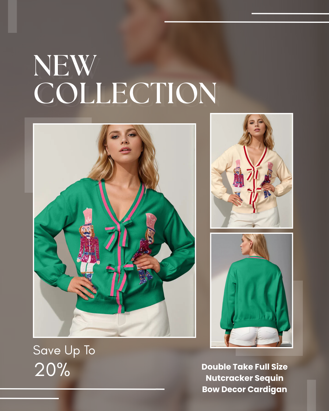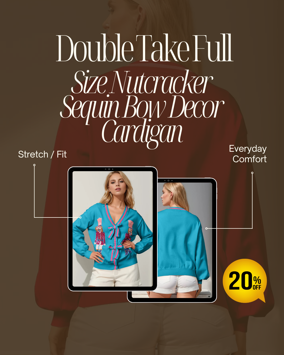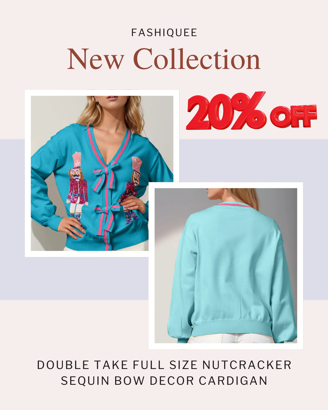 Double Take Full Size Nutcracker Sequin Bow Decor Cardigan Images