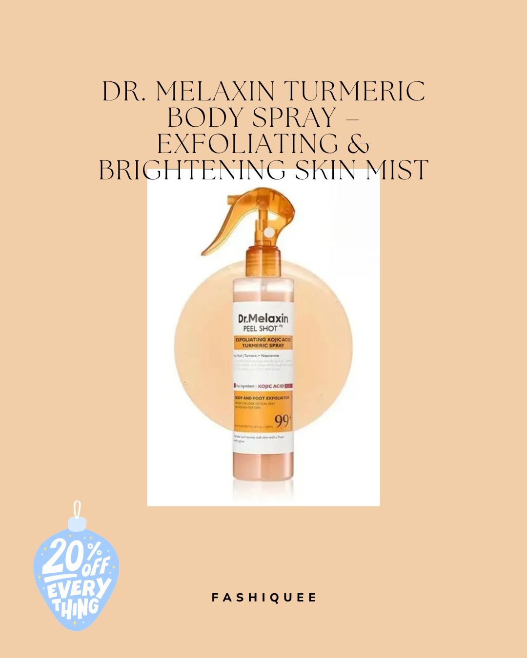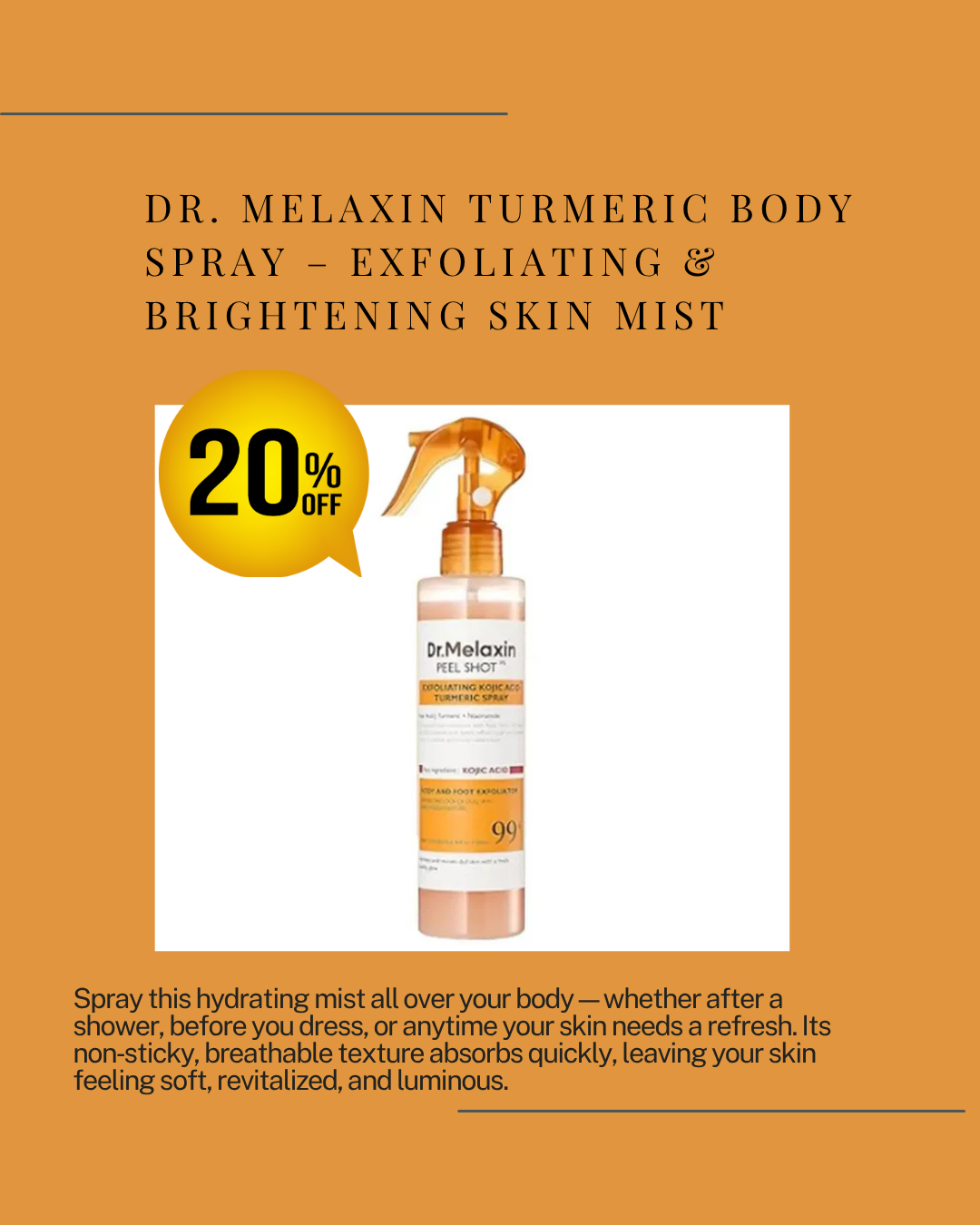 Dr. Melaxin Turmeric Body Spray is an exfoliating and brightening skin mist that nourishes and revitalizes your skin. Infused with turmeric extract and kojic acid, it removes rough patches, evens skin tone, and boosts radiance while providing lightweight, serum-like hydration. Perfect for daily use, it leaves your skin soft, smooth, and glowing without any sticky residue.