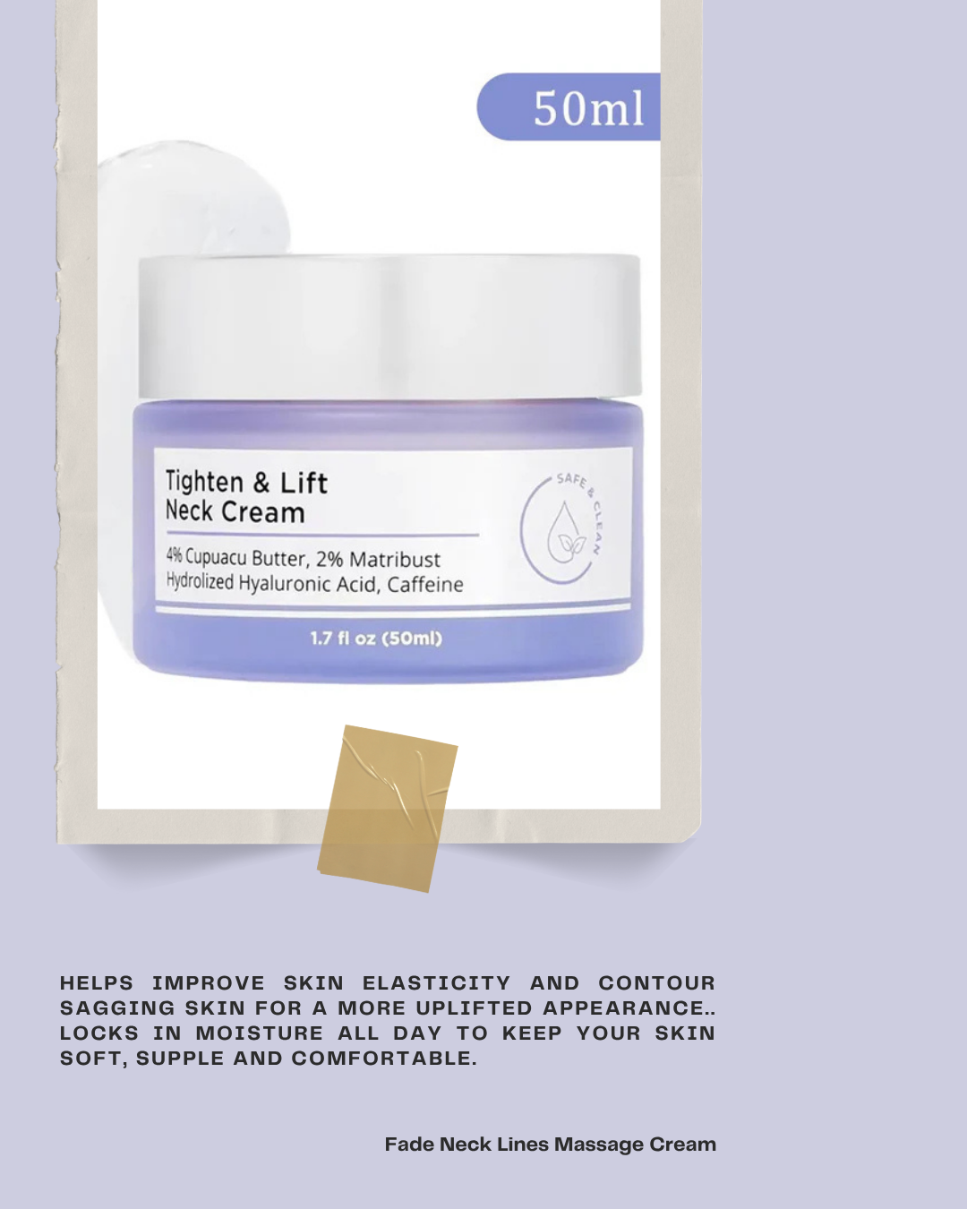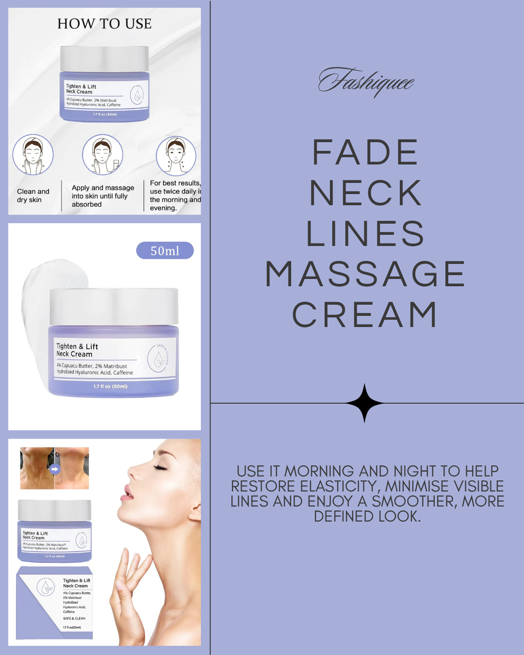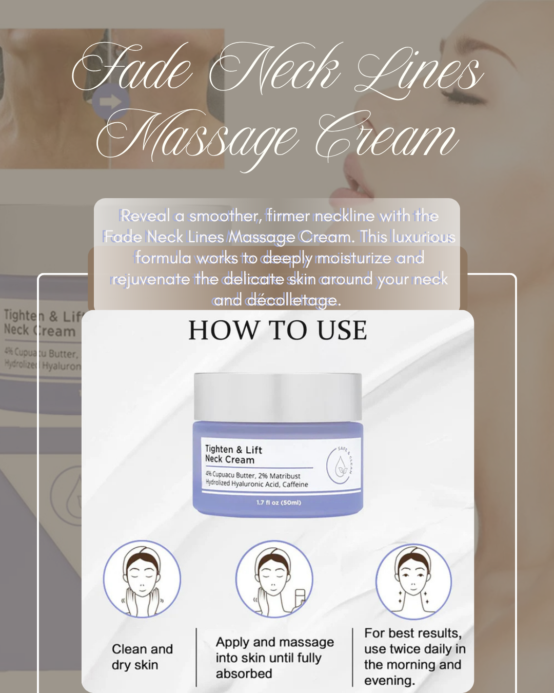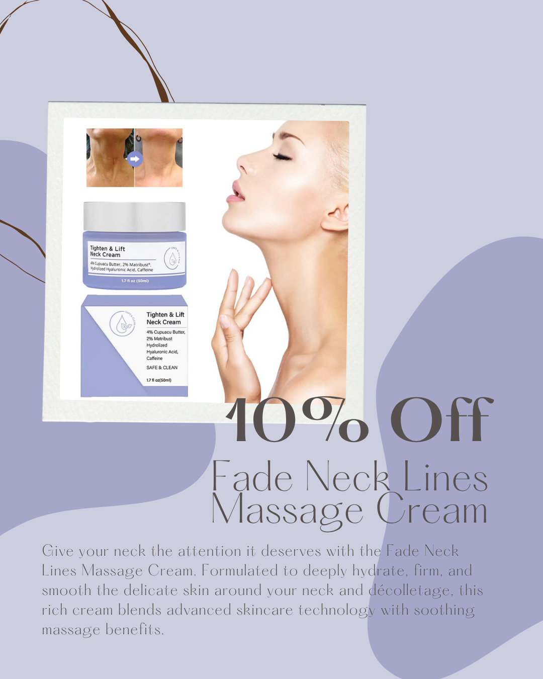 Say goodbye to visible neck lines and sagging skin with our Fade Neck Lines Massage Cream. Packed with collagen-boosting ingredients and intense hydration, it smooths, firms, and revitalizes the delicate neck area. Unlike ordinary creams, it’s designed to tighten and lift while promoting natural elasticity, leaving your skin soft, youthful, and radiant.
