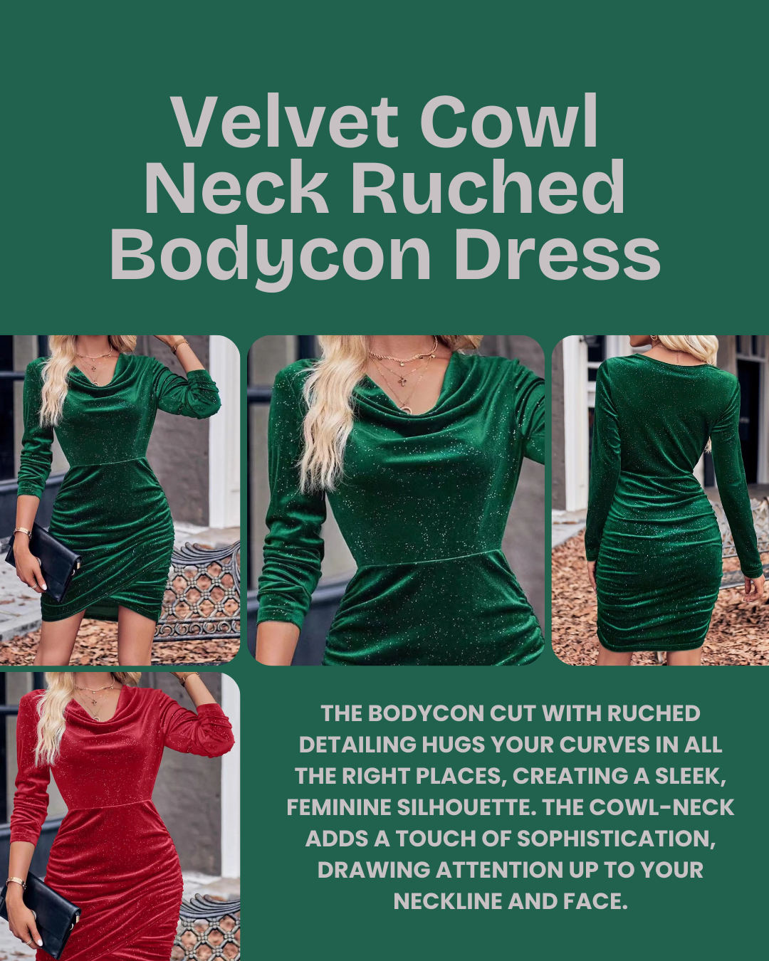 The Velvet Cowl Neck Ruched Bodycon Dress combines luxurious comfort, flattering fit, and versatile style. The velvet fabric gives you a soft, premium feel, ideal for evening wear. The bodycon silhouette hugs your curves in a flattering way, while the ruched detailing and cowl neckline add elegance and subtle sophistication that elevate your look, making it perfect for parties, dates, or special occasions.
