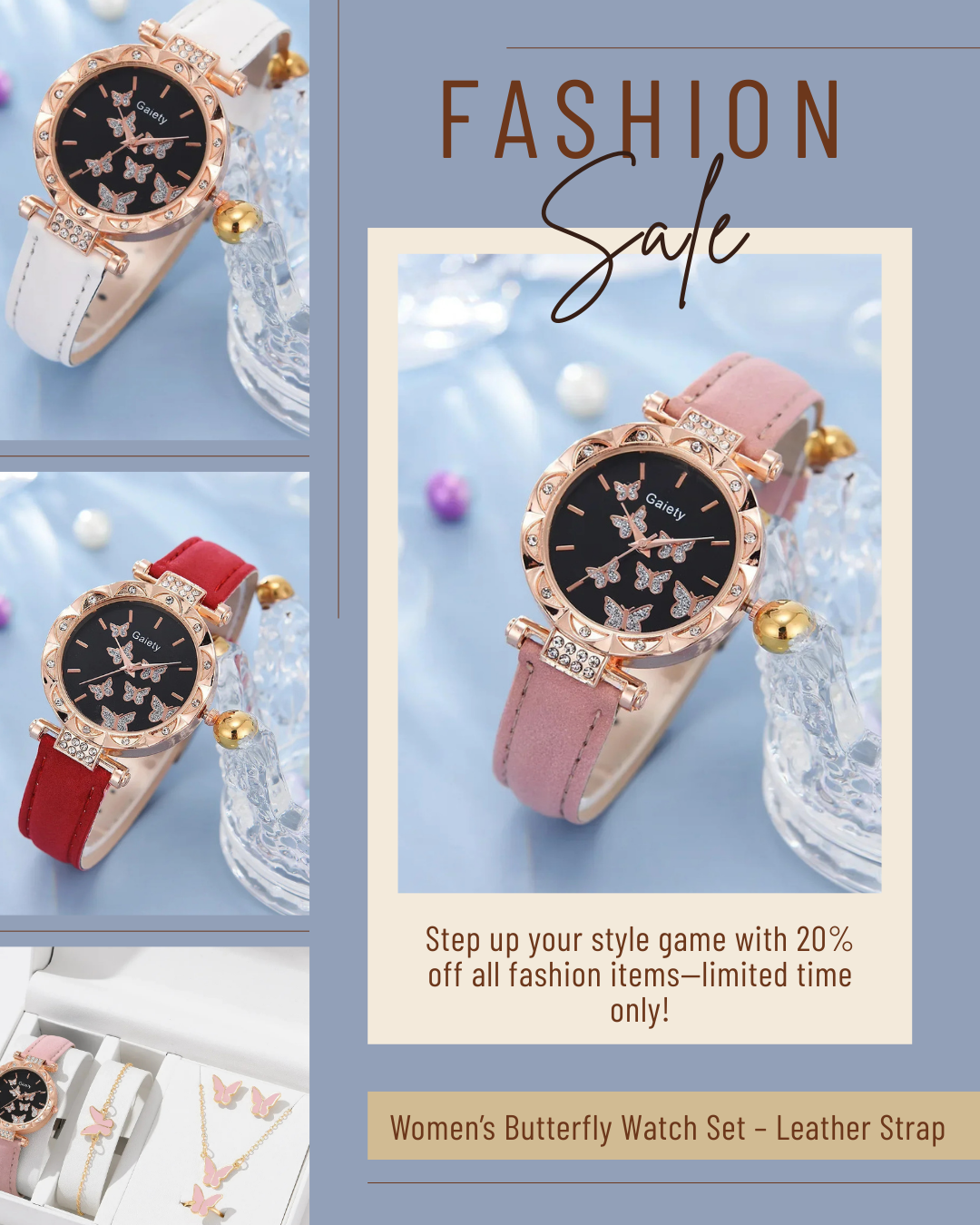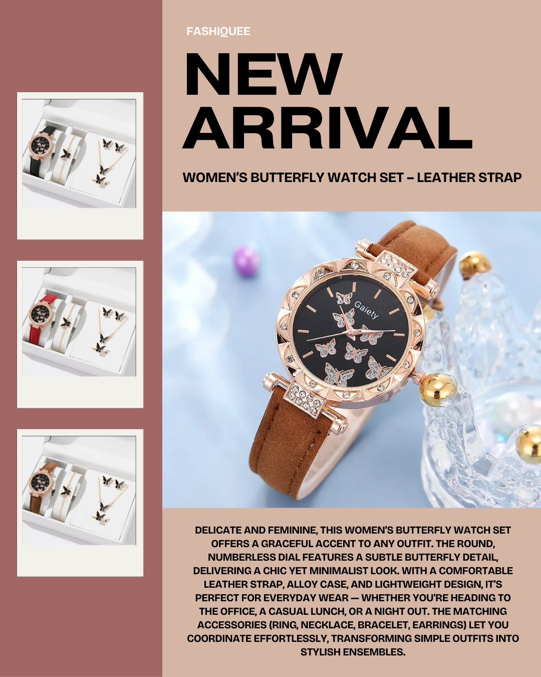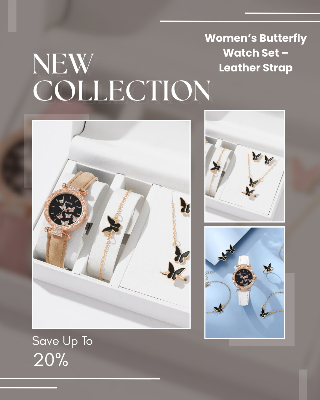 Women’s Butterfly Watch Set – Leather Strap Images
